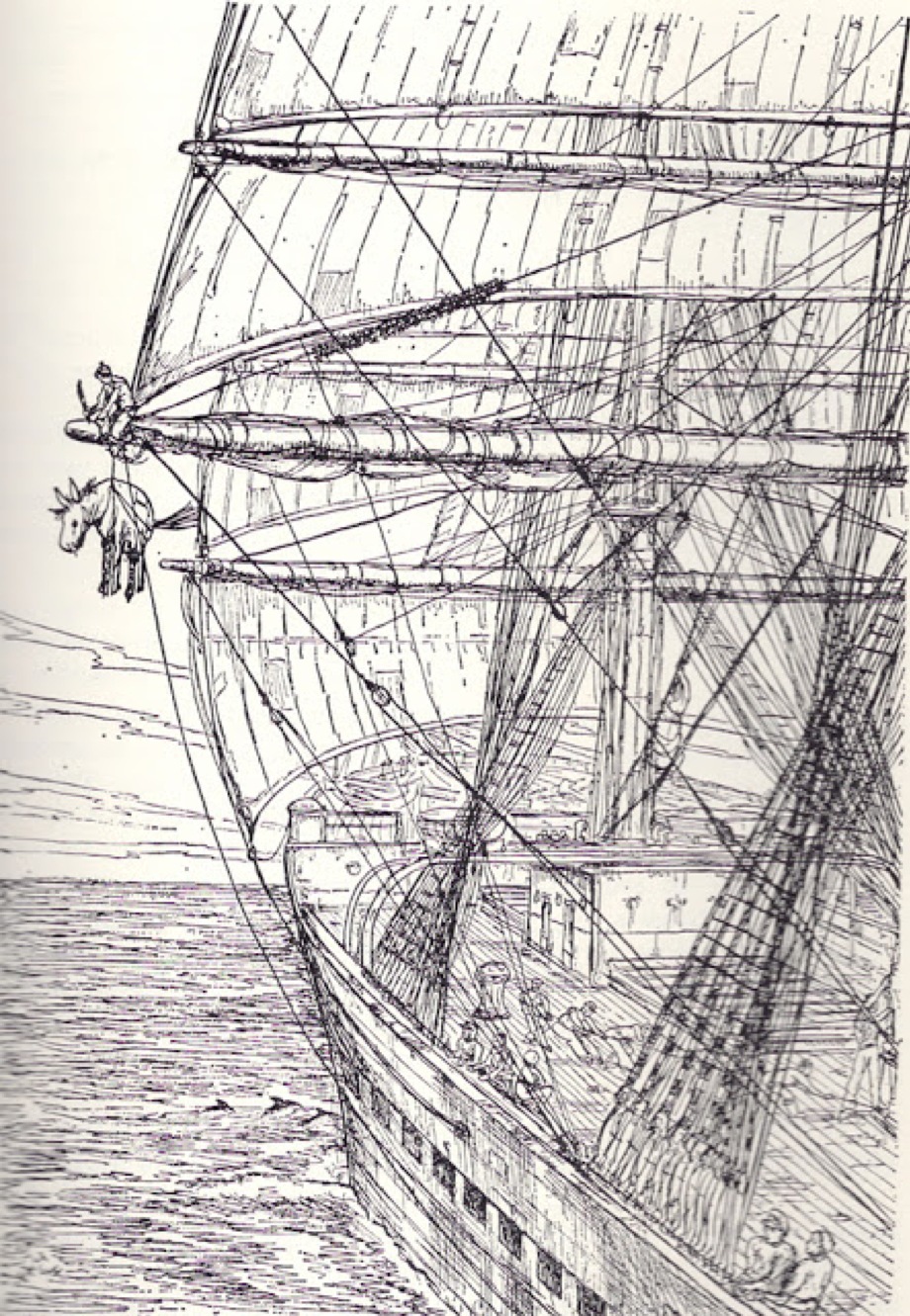 … The crew dress up a figure to represent a horse; its body is made out of a barrel, its extremities of hay or straw covered with canvas, the mane and tail of hemp, the eyes of two ginger beer bottles, sometimes filled with phosphorus.  When complete the noble steed is put on a box, covered with a rug, and on the evening of the last day of the month a man gets on to his back, and is drawn all round the ship by his shipmates, to the chanting of the following doggerel:—