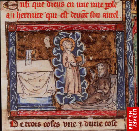 Christ appears to a hermit in a vision, holding a book containing the true history of the Holy Grail. From History of the Holy Grail, French manuscript, early 14th century