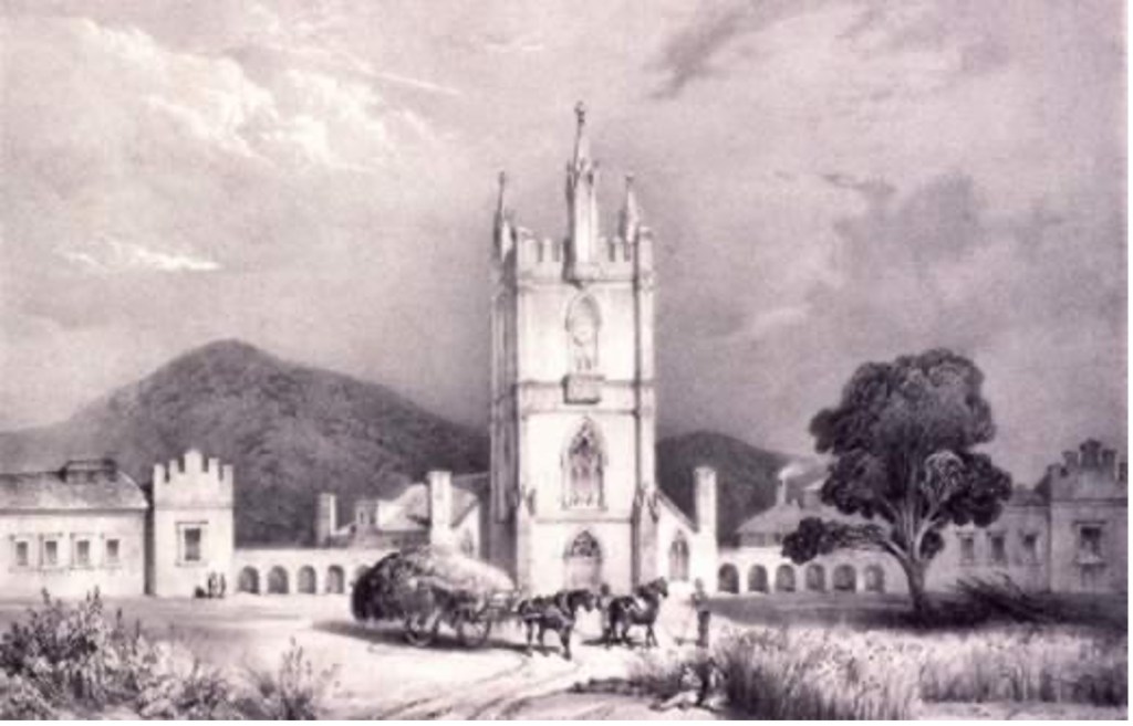 The King’s Orphan Asylum, later known as the Queen’s Orphan Schools, the girls’ school to the left of the chapel, boys’ school to the right, Mount Wellington in the background. The idyllic scene masked the horrors which were imposed on its inmates.