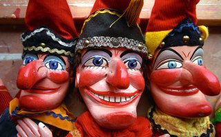 The puppets now known around the English-speaking world as ‘Punch and Judy’ arrived in England by way of Italy and France in the seventeenth century. Based on the Italian commedia del arte character of Pulcinella, or Punchinello, the play rapidly developed a distinctive English variation that included the introduction of the female figure eventually to be known as ‘Judy’. The Punchinello character was known to the slangery of the day as ‘Punch in hell’, a description that reportedly irritated the more respectable members of Mr Punch’s audience.